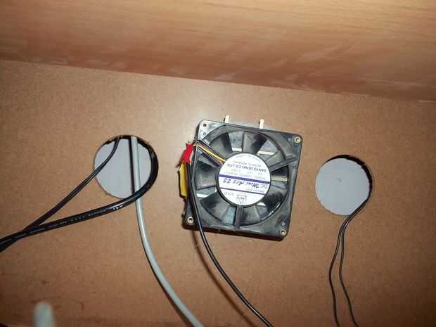 Después de quitar dos cajones para acceder a la parte trasera de los cajones - hice tres agujeros circulares y colocan un ventilador en el centro uno (con un filtro) - aire vendrá por allí y a través de los otros dos (esperemos que después de tomar el calor de la computadora).