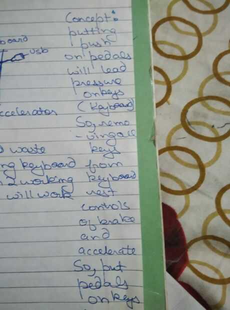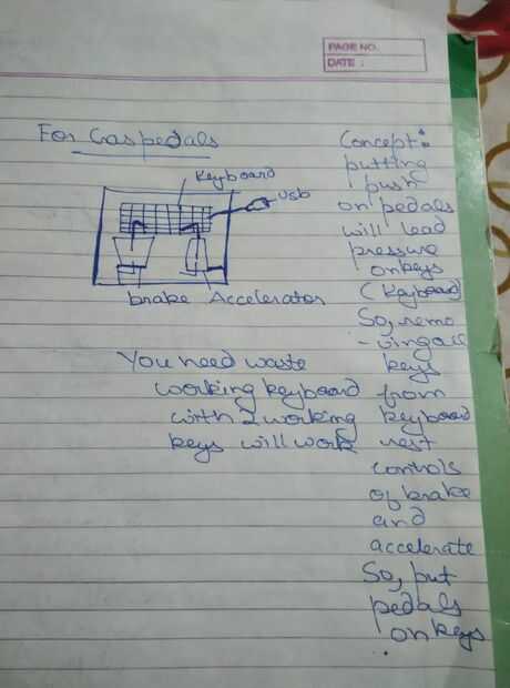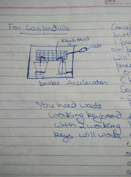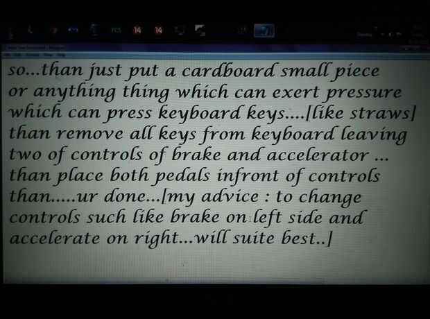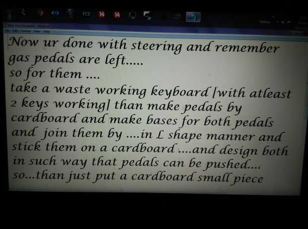 Ahora... ur con dirección a conectar USB del ratón.. .abrir ratón joystick y abrir el juego... y jugar... ahora... para teclado... su muy simple... sólo... .cut dos formas como de los pedales de freno y acelerar (una amplia y un ancho menor) de cartón y también dos bases para ellos... tanto... que unirlos de tal manera.. .like... L estructura.. .en tal forma en que los pedales pueden ser empujado... véase el higo... de tomar el teclado y quitar todas las teclas dejando a dos de los controles de freno y acelerar que pegar ese teclado en una cartulina... que.. .aferraos una paja enfrente de cada pedal hacia abajo hacia las teclas del teclado... así que cuando vamos a presionar que empujará pedal clave... pero recuerde cortar paja... no tome tamaño entero... que... palo ambos pedales en cartón con el teclado enfrente de sus controles como el freno de pedal de llave de freno y aceleran... pedal de acelerar Llave... para los detalles vea fig... y la cabeza hacia el siguiente y último paso. ....