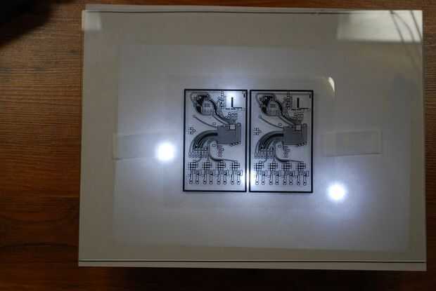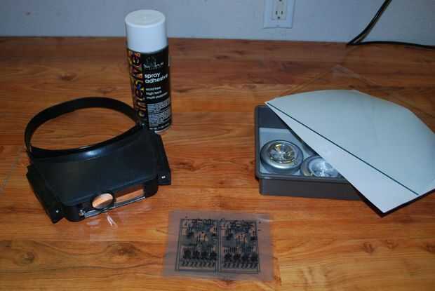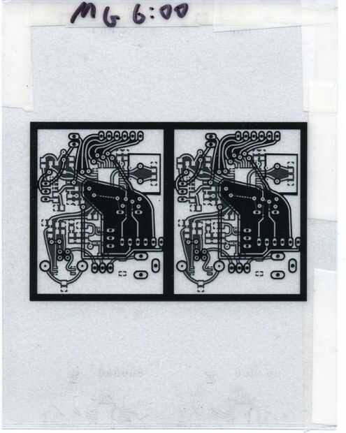 9. Alinee la tapa y arte inferior (lado de toner en) cinta firmemente, dejando suficiente espacio para deslizar el PCB entre.  Alternativamente, si usted tiene una frontera que es por lo menos una pulgada por el tablero, puede aplicar spray adhesivo a una franja de 1/2" a lo largo de dos bordes cubriendo el resto de la máscara con la esquina de un pedazo de papel, asegúrese de no menos de 1/4" entre la cinta adhesiva y el borde del tablero.