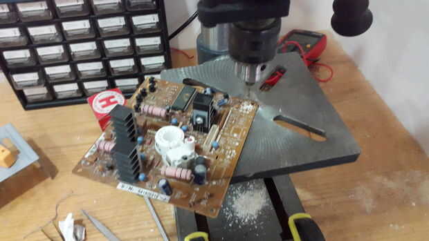 He utilizado un taladro de columna, pero puede ser perforados con un taladro de mano. A fijar el PCB en una prensa o una pinza.