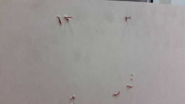 Coloque la placa sobre los agujeros del tablero MDF y pase el alambre por los orificios de anclaje.
