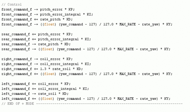 Echada y rodillo Filtros complementarios, así como cálculo de error del ángulo. pitch_command y roll_command provienen de la radio y se transmiten desde la estación de tierra basada en entradas del usuario. MAX_ANGLE es una constante que define el ángulo de la echada y del rodillo de ordenada máximo en grados de definir usuario. Los términos control integral son todos comentados, pero no dudes en jugar con ellos.