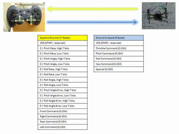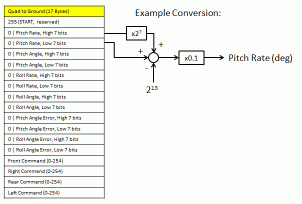 Los datos se envían en paquetes de un byte a la vez, a 57600 bits por segundo. Elegí este bitrate porque también es el ratio de morosidad para el bootloader de Arduino, así que usted puede programar el Arduino Pro Mini sobre XBee sin necesidad de un cable de programación independiente. (Todavía tienes darle reset en el Mini Pro.) La segunda imagen muestra el flujo de datos y las definiciones de bytes de los paquetes de comando y telemetría. La tercera imagen muestra cómo recuperar el ángulo y tipos de angulares en grados (por segundo) de los datos de telemetría crudo.