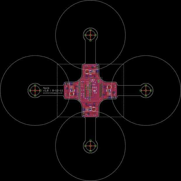 contorno de placa de 4pcb (capa de la "Dimensión" en águila) es realmente la forma del marco cuadrotor. La mayoría de las compañías de impresión Junta dirigirá la dimensión exterior de la placa a cualquier forma que usted especifique. (Asegúrese de que se trata de una opción antes de usted orden.) Dibujo la forma tuvo algo de práctica con las herramientas de arco de águila. Una idea que ha sugerido es añadir diagonal admite entre los brazos. Sin embargo, esto crearía zonas de encaminamiento interno, y mayoría de las empresas de la Junta cobra extra por.