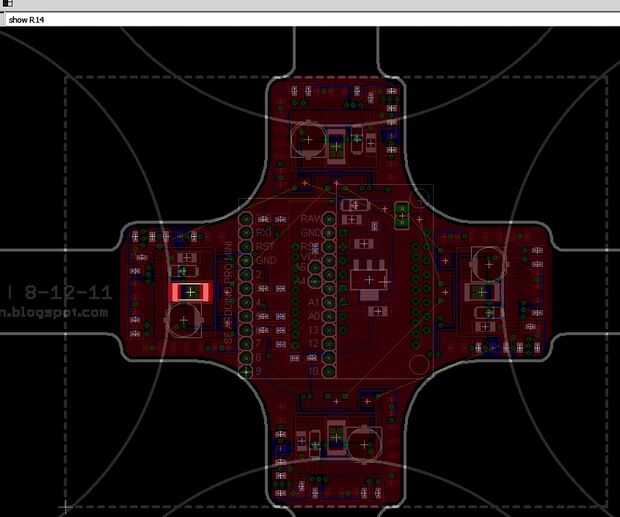 Los designadores de parte (por ejemplo, "R15") en la capa de "Nombres" en EAGLE no se procesan en la serigrafía. He decidido dejarlos porque la densidad de los componentes es lo suficientemente alta como que hacerlos no superposición sería un proceso desperdiciador de tiempo. En cambio, el método que suelen utilizar para la colocación de piezas es que la placa de águila abiertos en una computadora cerca y utilizando el comando "show" para resaltar cada componente como ir. (Ver tercera imagen para un ejemplo de esto).
