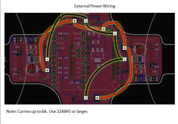 Por ahora, sin embargo, los cables de alimentación se realiza externamente con 22AWG o mayor, preferiblemente trenzado de alambre. Hay un total de 8 saltos de alambre para hacer, cuatro por el poder y cuatro para la tierra. (Ver segunda imagen). Para eliminar los bucles de masa, se podría utilizar una configuración de la estrella de la entrada de energía de la batería a cada regulador del motor. Encontré que un autobús funciona muy bien, aunque. (Tenga en cuenta que en un autobús, los cables de alimentación fuera de la entrada de alimentación principal llevan la más actual). Tenga cuidado de no invertir alguna de estas conexiones, o destruirán inmediatamente el regulador del motor en energía arriba