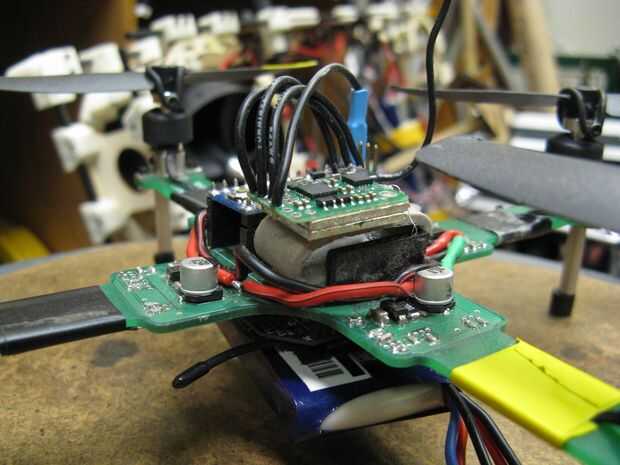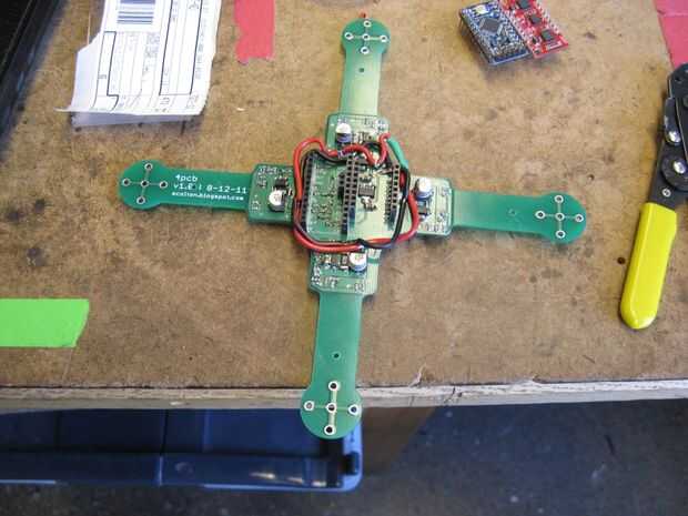 Diseño original de este cuadrotor pidieron ahora-obsoleta Sparkfun 6DOF afeitar IMU. El nuevo diseño utiliza el chip minIMU-9. El mínimo-9 es una IMU digital, que tiene algunas ventajas agradables (mayor resolución ADC que el Arduino, puesta a cero automática). También es más pequeño que la IMU Razor fue y sólo requiere cuatro conexiones para comunicar con el Arduino Mini Pro por I2C serial.