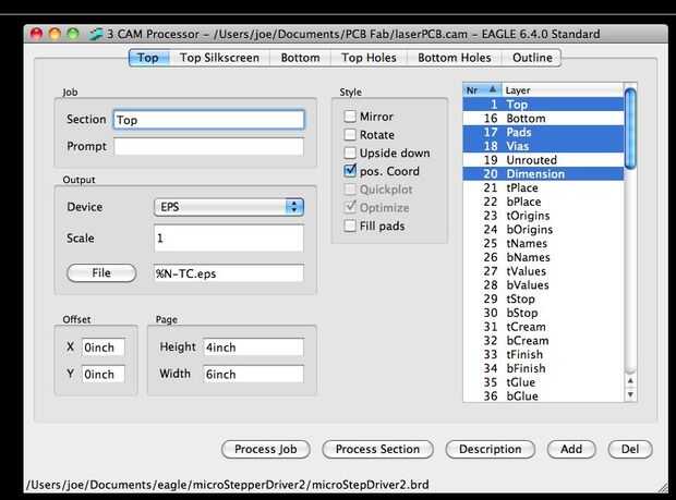 (8) querrá varios archivos (contorno de la placa superior cobre, cobre inferior y agujeros) en un formato que puede ver su programa de gráficos de salida. Águila puede generar archivos EPS, y el archivo laserPCB.cam adjunto está configurado para sacar las capas apropiadas automáticamente. Seleccione en el menú de archivo: "CAM procesador..." luego elige "Archivo > Abrir > trabajo" y abrir el "laserPCB.cam" suministrado y haga clic en "Proceso de trabajo" para generar los archivos.
