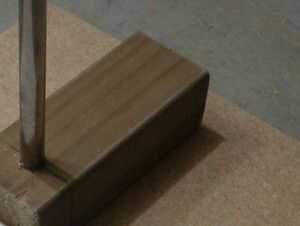 Suavemente golpee la varilla en el bloque y montar el bloque en la tarjeta base con pegamento y clavos de debajo. Si la barra es vertical no exactamente puede que necesite algo en un lado (yo usé un par de clavos) de la cuña.