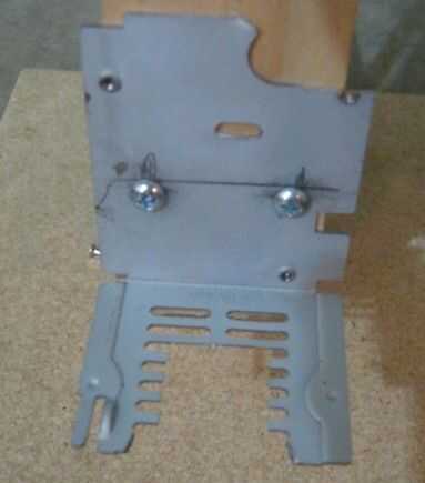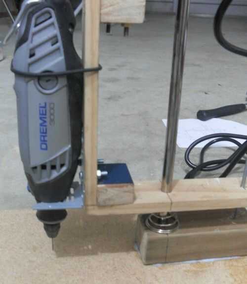 Quería ser capaz de eliminar fácilmente el Dremel para usarlo para otras cosas. Utiliza un poco de forma de 'L' de metal de la carcasa de una vieja radio de coche y corte una ranura para encajar el cuello de la Dremel y (para permitir el ajuste) atornillada a la parte vertical del marco.