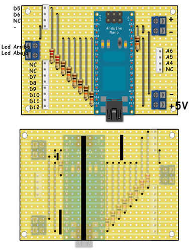 Hechas ya las placas de luz, pasé una diseñar la plaza donde iba a estar el Arduino Nano, los conectores, resistencias y demás parafernalia del circuito. Cómo era muy sencillo y me coincidían los agujeros, use una placa de prototipos y después de varios dibujillos la cosa quedó como sigue.