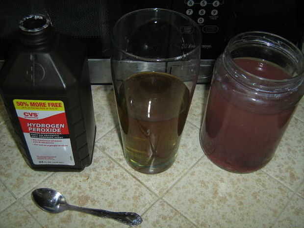 3. Agregue 1/2 cucharadita de peróxido de hidrógeno en el electrolito utilizado, cambiando su color (no revolver con una cuchara de metal - plástico de uso).