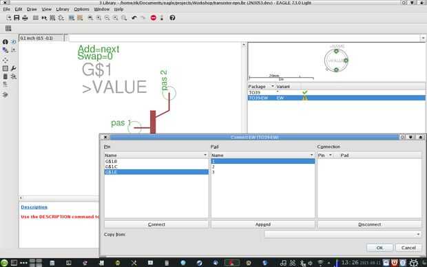 Hecho. O mejor dicho, casi terminado, porque hay dos transistores en el diagrama esquemático, de dos bibliotecas diferentes: transistor npn y transistores pnp. Sólo uno, nos hemos modificado ahora para copiar el nuevo paquete en el otro.