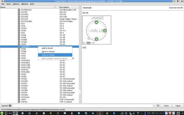 Guarde y cierre la biblioteca ha estado editando (transistor npn) y abrir el transistor pnp, luego volver al panel de control. Ampliar la biblioteca de transistor npn y el árbol de paquete en él. Localizar el paquete TO39-EW que ha creado, simplemente haga clic derecho y seleccione 'Copiar a la biblioteca'. Ahora puede repetir los dos pasos anteriores para agregar otra vez el paquete -EW, en este caso, el 2N2905. Ahora estamos listos para modificar realmente la Junta