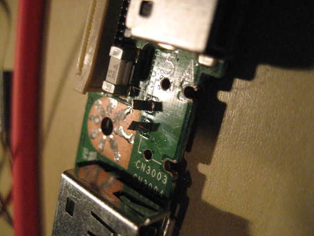 -Soldar el conector en el daughterboard, tomando nota de la polaridad. La trenza de desoldar es útil aquí. El blindaje en el conector es de aluminio y se absorberá el calor, ver la temperatura en el tablero, se calentará.