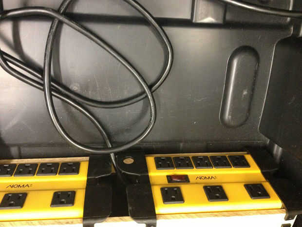 Mida y corte un pedazo fino de madera para montar barras de potencia en la parte inferior del pecho caja de herramientas. Sujetar las barras de energía que pueden acomodar a 15 cargadores (hemos utilizado dos Noma ocho salida barras de potencia comprados en venta en nuestro local neumático canadiense). Taladre un orificio que permite el cable de alimentación salir del pecho de la caja de herramientas para enchufar la fuente de alimentación.