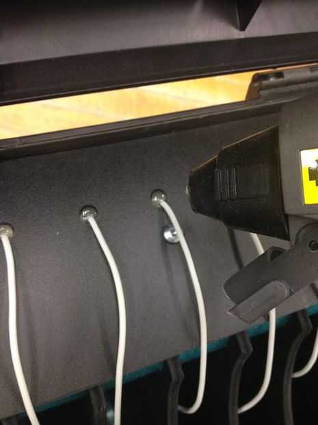 Coloque un pequeño toque de pegamento caliente en cada cable de carga para evitar que caiga en el pecho de la caja de herramientas.