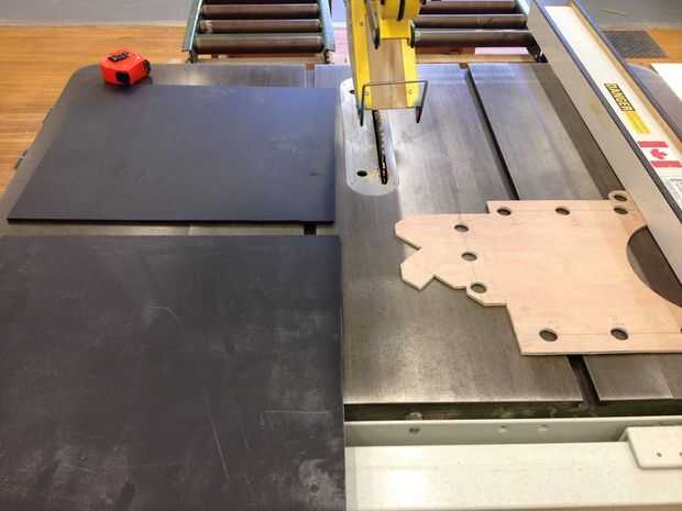Apilar cuatro trozos uno encima del otro (ver paso 6) y la abrazadera junto con el patrón de divisor en la parte superior que le permitirá localizar los agujeros durante la perforación de lo plástico. Puede poner un pedazo corto de tubería de plástico en los orificios para sujetar piezas juntas mientras que usted está cortando todo el patrón utilizando una sierra de banda.