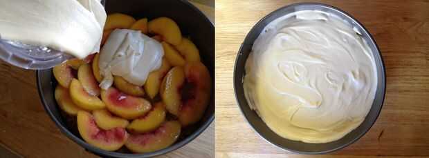 Verter la mezcla sobre los melocotones y repartidas uniformemente en los melocotones con la parte posterior de una cuchara grande o una espátula flexible.