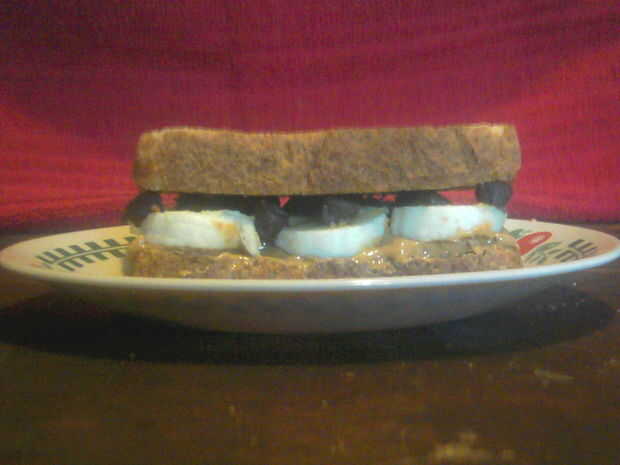 aquí es un bocadillo delicioso peahonana, hecho de mantequilla de maní, banana y miel, con trocitos de chocolate.
