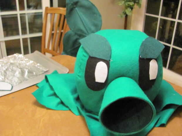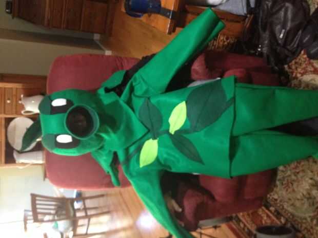 Coser la hoja Coloque en el centro de la parte posterior de la cabeza. Para el cuerpo del traje usé un simple patrón de traje de Cowboy. Hacer pantalones y una camiseta básica. Luego hizo varias hojas más, aplica la maravilla bajo respaldo y planchadas en la parte delantera. Lo siento por las fotos que no giran correctamente. Se orientan correctamente en mi ordenador pero no puedo subir sin ellos ser rotado incorrectamente.