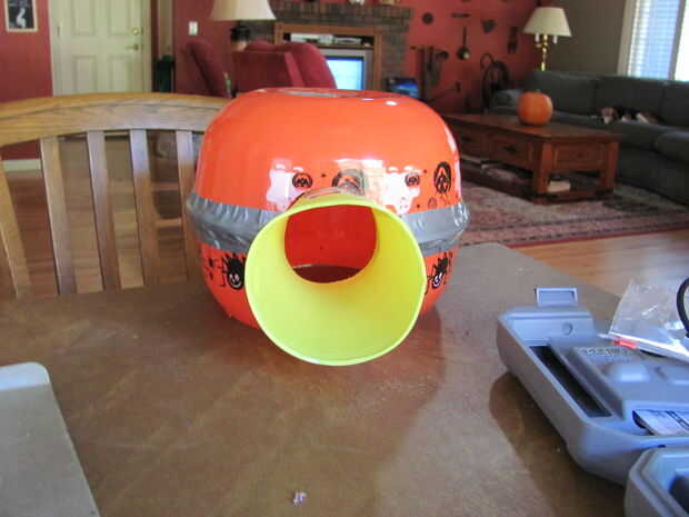 Utilizando el megáfono traza un círculo en un lado de los tazones de fuente. Es este corte que se insertará el megáfono. Utilizando una herramienta de corte como una dremel, cortar el círculo trazado y retire. Prueba el tamaño del agujero correcto con el megáfono y luego extráigala para terminar la cabeza.