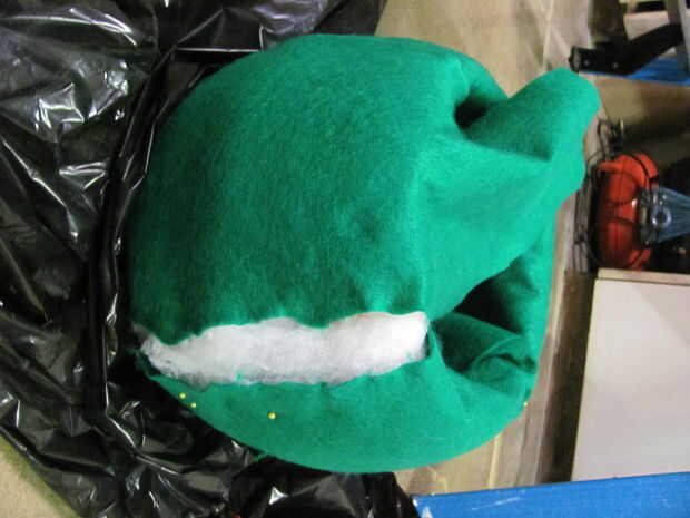 Utilizando verde fieltro siga los pasos para aplicar el bateo. Al principio, otra vez usé el adhesivo en aerosol pero terminó haciendo un lío, así que decidí coser las solapas en su lugar. Era más fácil y creo que la mejor forma de aplicar el fieltro.