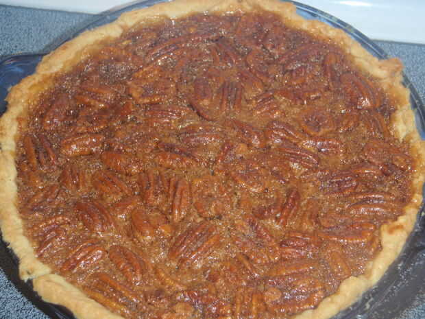 Combinar el azúcar, huevos, vainilla, jarabe de maíz, sal y harina. Cuando se combina totalmente (ya no puede discernir ingredientes separados) añadir el caramelo. Descarga exceso brandy y mezclar las nueces con mantequilla derretida. Doble en relleno.