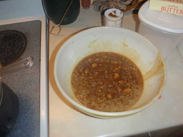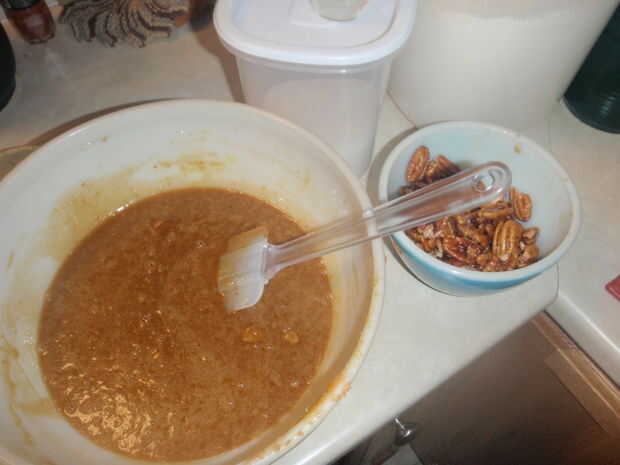 A continuación, colar sus nueces y mezclarlas con la mantequilla derretida. Conseguir las tuercas buena y engrasada. Todo el asunto se pliega amorosamente en el goo viscoso.