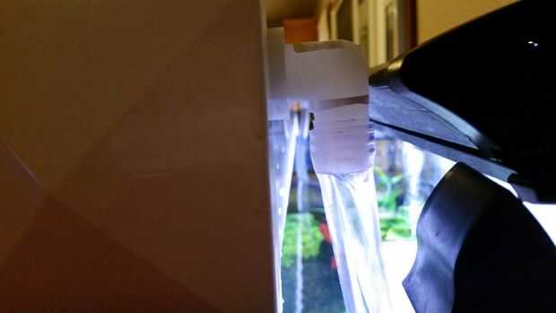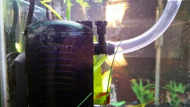Instalación de la cámara es bastante fácil. Use agua caliente para ablandar los extremos de la tubería y luego conectarlos de la bomba a la entrada y, opcionalmente, de la toma de abajo en su tanque. Usé una manguera en la salida porque, como he mencionado antes, odio el sonido del agua caer en mi sala de estar.