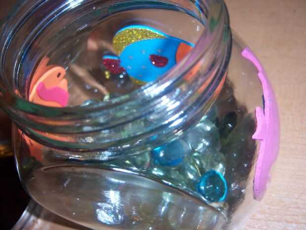 Coloque los adhesivos en el interior paredes de la jarra, excepto por el lado de frente. No olvide presionar contra los lados para sujetarlos.