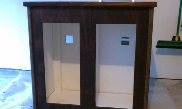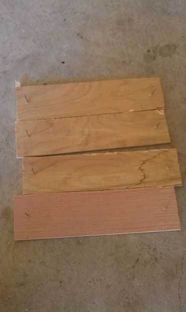 Para permitir que las puertas se seque más rápido, hacer soportes de madera y clavos (cuadro 8). El propósito de esto era poder manchar / poly ambos lados de la puerta en una hora y deje que se seque en los stands. Mancha la parte posterior de la puerta primero, luego Dale la vuelta y descansar sobre dos de los soportes para permitir que la coloración de la parte delantera. Si las uñas son filosas ponen pequeñas abolladuras en la madera así que tenga cuidado acerca de eso.
