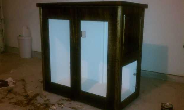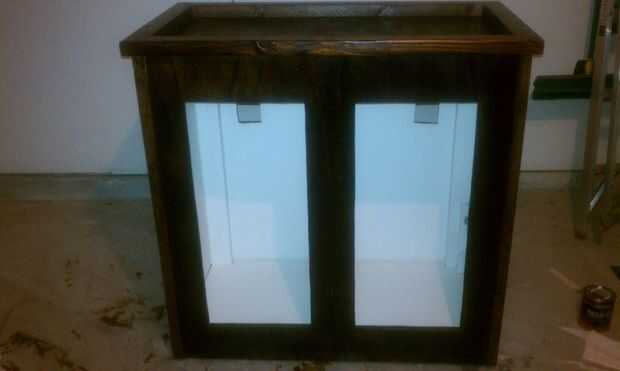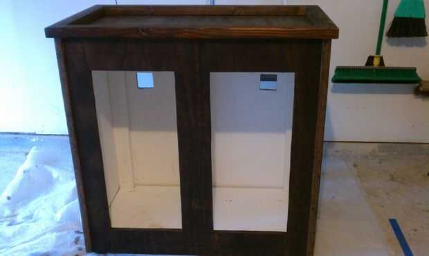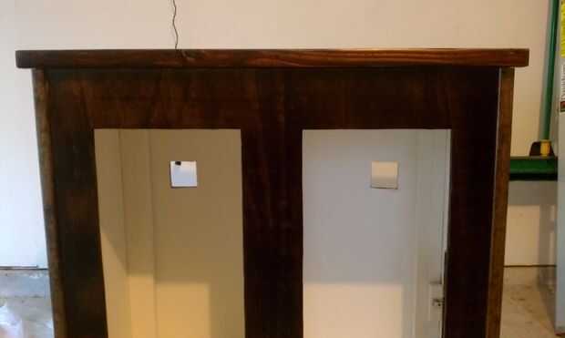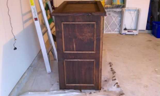 El stand entero con un papel de 150 grano arena antes de la tinción de la arena. Si el 2 x 3 para la parte superior ajuste áspero, use un papel de grano arena inferior para tenerlo tan liso como sea posible. Después de lijar, limpiar todo con un trapo limpio y seco para quitar el polvo.