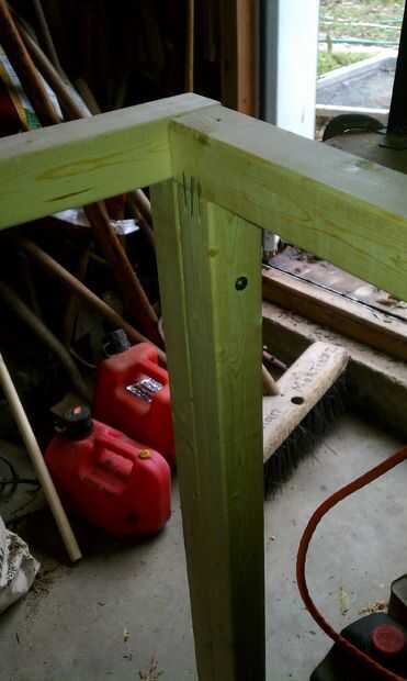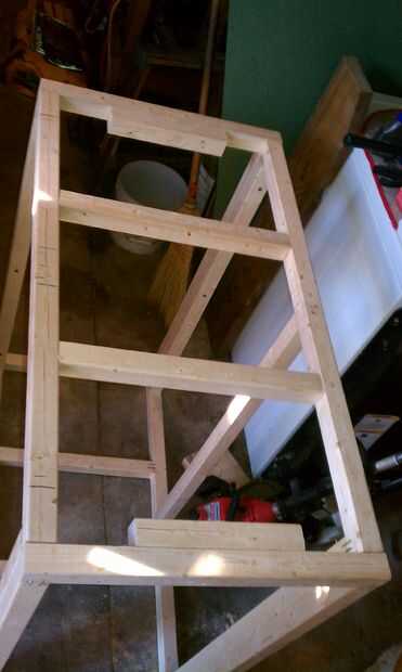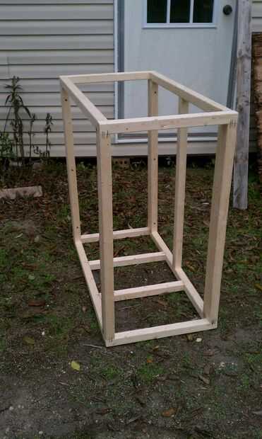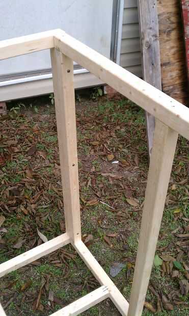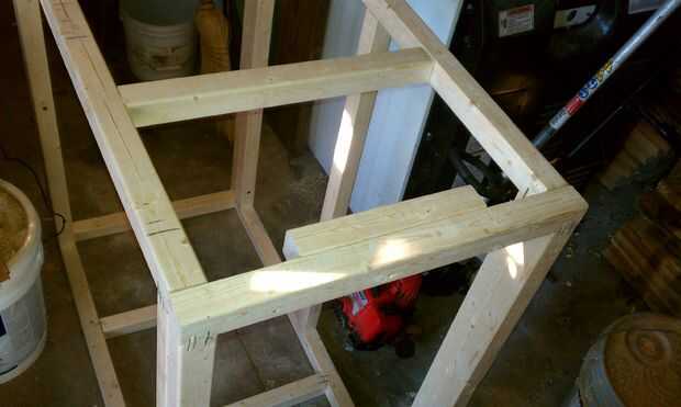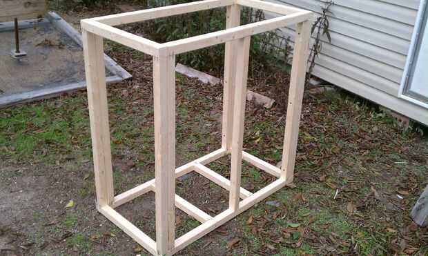 Asegúrese de que los miembros estructurales son apretados junto sin espacios, ya que esto alterará la dimensión total de la base del gabinete. Observe en la (Foto 2), al lado de marcos se atornillan a la parte exterior de la parte delantera y trasera de Marcos. Esto permite más espacio entre los miembros de la estructura del lado (que será importante más adelante cuando instalar el tanque) sin hacer el gabinete cualquier mayor que la necesaria. Una vez finalizada la estructura de la base, que debe medir 19 3/4" profundidad x 37 3/4" de ancho x 37 1/2" alto. Dos 2 x 2 fueron agregados a la parte superior y en la parte inferior para ayudar a soportar el peso de los tanques. Miden 16 3/4" cada y se coloca aproximadamente 10" - 11" aparte y sujetadas en cada extremo con dos clavos de 2 1/2". (imagen 4) Bloques de chatarra fueron agregados (con tres clavos de 2 1/2") a cada lado en la parte superior para un apoyo extra para el peso del tanque, ya que el tanque real estará descansando en la parte superior de madera contrachapada y en el interior borde de los miembros de la estructura.