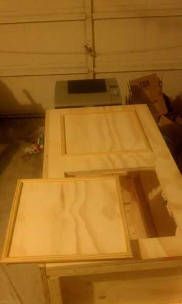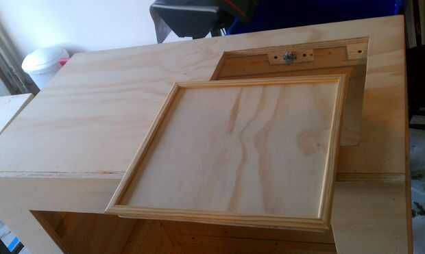 Después de que el pegamento esté seco, pequeños clavos por la parte posterior también fueron utilizados. (Fig.4), éstos probablemente no eran necesarios. Colocar la puerta escondida. El marco superior ajuste ahora puede pegado y con tachuelas en el lugar. Debe coincidir con la moldura de la puerta y aspecto uniforme. Los bordes de marco de imagen deben ser aproximadamente 3" por los lados y 2 3/4" de la parte superior. (Estos pueden necesitar ajustarse ligeramente). Después de seco, el gabinete al otro lado del tirón y pegamento y tack recortar de la misma manera, utilizando las mismas medidas y métodos.