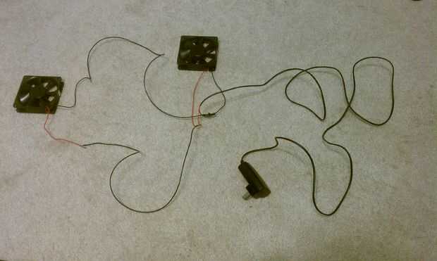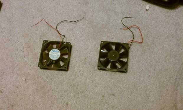 Si los ventiladores están conectados de esta manera, ambos ventiladores deben girar la misma dirección. Si se desea direcciones opuestas, el cableado del tirón en uno de los ventiladores o vuelta el ventilador sólo cuando coloque en el soporte. La soldadura de las conexiones y envuelva con cinta aislante.