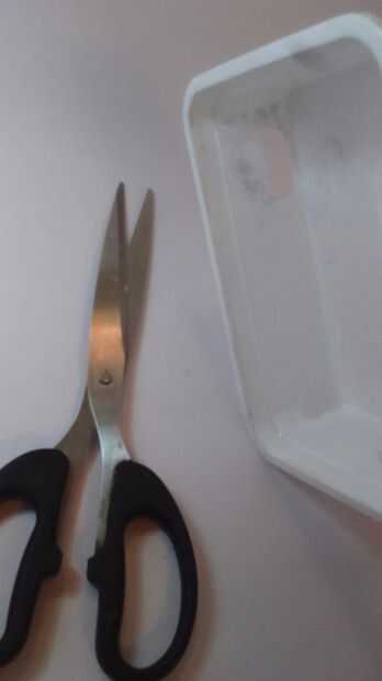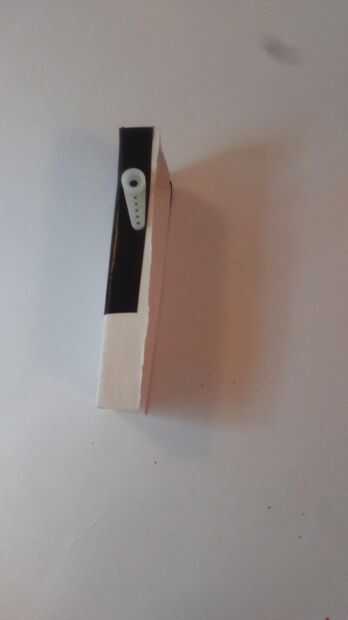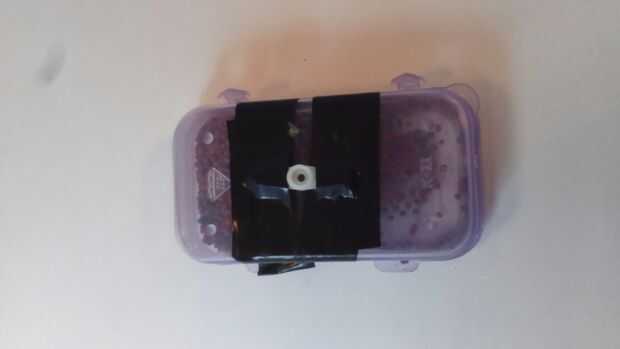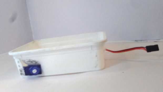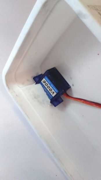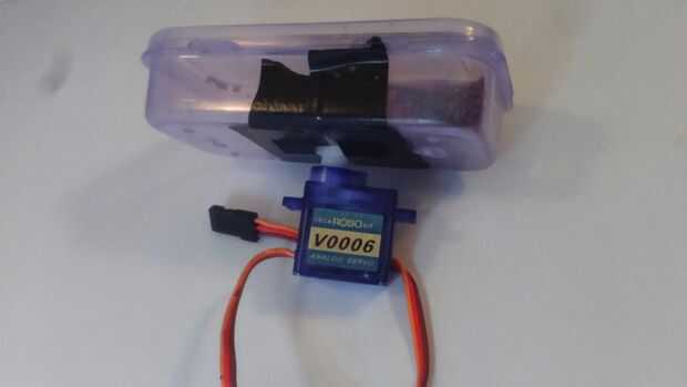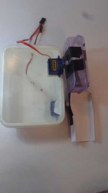 Segunda parte B: Las siguientes cuatro imágenes representan la construcción implicada por el segundo motor de Servo. Cortar un agujero en la caja de plástico con unas tijeras o una cuchilla (fig. 4) tal que el motor Servo ajuste (fig. 5, fig. 6). Ahora toma una tarjeta de visita y dóblalo como se muestra en la figure(fig. 9). Luego coloque un cuerno del Servo a esa tarjeta y cinta adhesiva como lo hicimos para el caso de alimentos de peces.