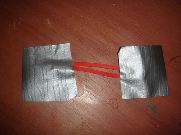 Para el mecanismo de lanzamiento que decidí usar una banda elástica de pedazos de cinta. Así que empecé por cortar 2 trozos pequeños de cinta adhesiva y luego las fijadas a los extremos de la banda. Debe verse así cuando haya terminado.
