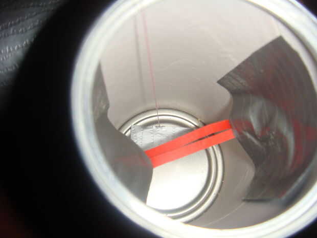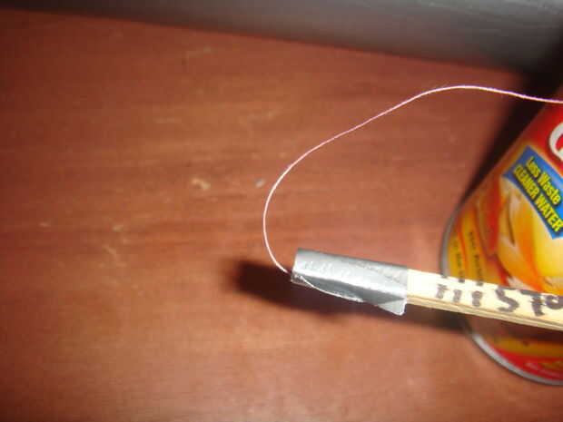 Medido el poder y fue alrededor de 4 pulgadas, así que corte el hilo de 9 pulgadas, duplicarla, además de agregar una pulgada extra para asegurar, a continuación, pongo un trozo de cinta en ambos extremos, poner la cinta alrededor de la mitad una pulgada en el hilo de sujeción de un extremo en el palo y el otro en la parte inferior de la lata y asegúrese de fijar firmemente por lo no meter a nadie ojo, recuerda también a otro extremo de la palanca, a continuación, se puede personalizar con un mensaje personal!
