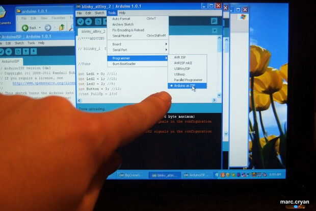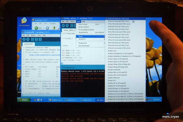 - Descargar al ATtiny, luces parpadearán (mirar a través de los 2 agujeros), habrá un mensaje de error (2 del mismo mensaje) pero que está bien.