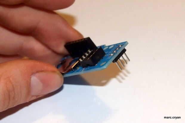 Clavijas van en la parte inferior del tablero. Si no desea volver a programar el chip ATtiny entonces puede dejar estas. También podría intentar dejar estos sin soldada, debe permanecer en el lugar serán suficiente para programar con Arduino y quitarse después de la programación.