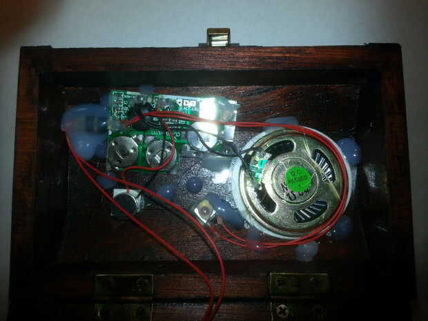 Entonces yo pegue el módulo en el interior de la tapa, ponga el sensor a través del orificio en el panel recién creado y el pegamento que en su lugar con pegamento así de caliente. Esto mantiene segura cuando la tapa se abre y se cierra y el panel de madera sirve como una buena manera de ocultar la electrónica y mantener el aspecto del pecho como estándar como sea posible. Después el empuje ajuste el panel en la parte superior hasta que esté ajustada.