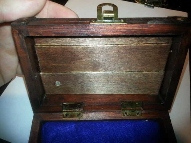 Para sostener el anillo simplemente cortar un trozo de espuma del tamaño de la parte inferior del pecho, caliente pega fieltro alrededor de él, entonces corte un agujero el centro muerto. La espuma es lo suficientemente fuerte como para sostener el anillo en su lugar. Si usted puede encontrar seda, utilizarlo, se ve mucho mejor que el fieltro. Yo también no pegue la almohada a la base del pecho por lo que si quiero quitarlo más tarde puedo usar el pecho para otras cosas, o mi esposa (esperemos) futura puede guardar otras piezas de joyería en él.