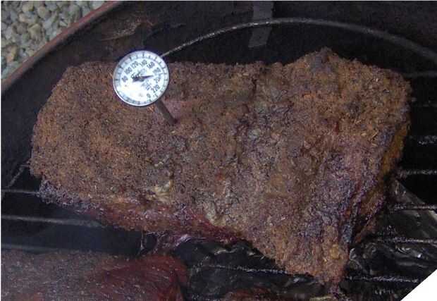 Para mi sorpresa mi pecho de 4 libras se hizo en 4 horas. 190 grados. Puse el pecho en un recipiente y bien cubierto el recipiente con papel de aluminio para descansar por 20 minutos antes de rebanarlo.