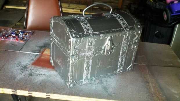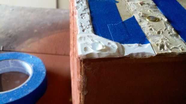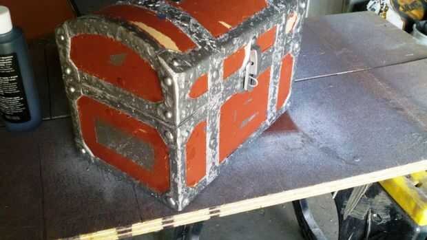 Es la parte más difícil. El siguiente es pintura, pero primero tendrá que agregar los remaches en las esquinas. He utilizado pegamento caliente, es rápido y fácil. Sólo tiene que añadir una caída a todos los rincones asegurándose de que son un poco planos y aspecto imperfecto. Ahora en la pintura! Máscara de todas las áreas que no forman parte de la estructura del pecho. Primero todo lo había preparado. No tienes que cebar si desea ahorrarse unos dólares, pero ayuda. Después de la primera capa, cubrí todo con plata martillado en aerosol de la pintura. Creo que era marca Krylon. Aplique varias capas, un mínimo de tres. Retire la cinta adhesiva cuando la pintura esté seca.
