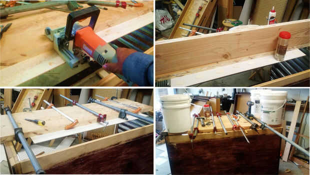 Primero la losa frontal fue biscuited, pegados y afianzado con abrazadera. El pegamento fue permitido para curar completamente y luego la losa posterior fue pegada y afianzado con abrazadera. Baldes pesados fueron colocados en la parte superior para evitar que las losas de madera arqueamiento.