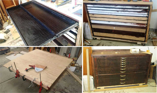 Diapositivas del cajón fueron atados a los lados y los cajones se resbalaron en las diapositivas de acoplamiento en el gabinete. Dos agujeros fueron perforados en la parte frontal de cada cajón para que el frente del cajón se podría unir más tarde.
