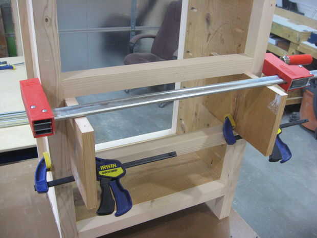 Se añadieron carriles frente al marco con tornillos cola y bolsillo de pecho. Éstos hicieron de 1 1/2" tiras de pino de 1 1/2".