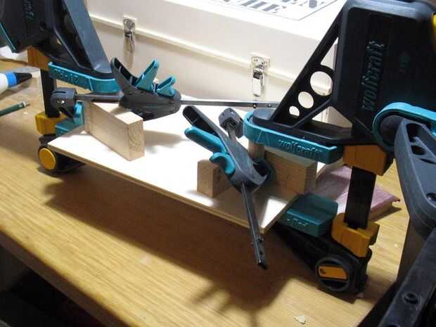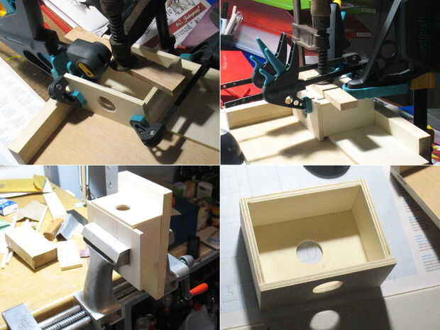 Para pegar he hecho una plantilla que es una simple tabla con dos listones atornillados en él. La usé para pegar las piezas de las piezas laterales y traseras en un ángulo recto. Entonces sujeta en un pedazo de chatarra por lo que tengo la altura adecuada para fijar la pieza frontal. Las tiras de la parte inferior no son complicadas, pero la parte inferior, pieza que tenía que conectar correctamente a la parte delantera.