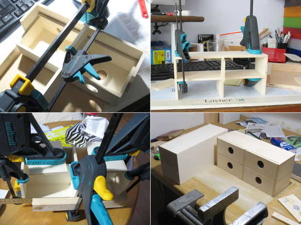 Luego vino colocar los separadores a sus cimas para conseguir cuerpos. Para el divisor en el centro usé dos cajones y algunas viejas tarjetas de bono para conseguirlos exactamente colocado. Terminar los espacios de cuatro cajón primero fijar antes el superior a sus más bajas. Entonces fue posible adjuntar el frente y la espalda piezas.